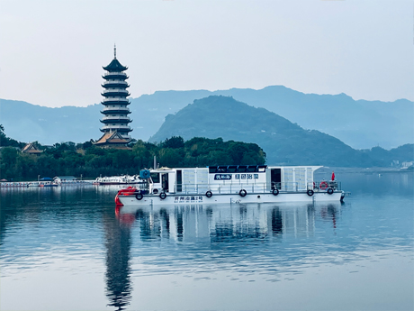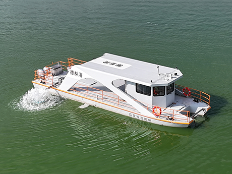 公司研發(fā)的加壓控藻船,以玻璃鋼船體為平臺,配置藍(lán)藻打撈、壓力控藻和曝氣裝置...